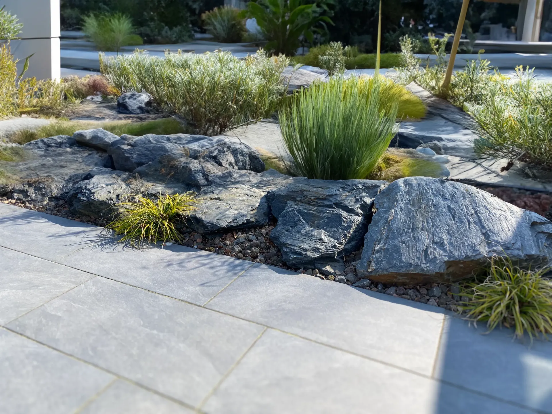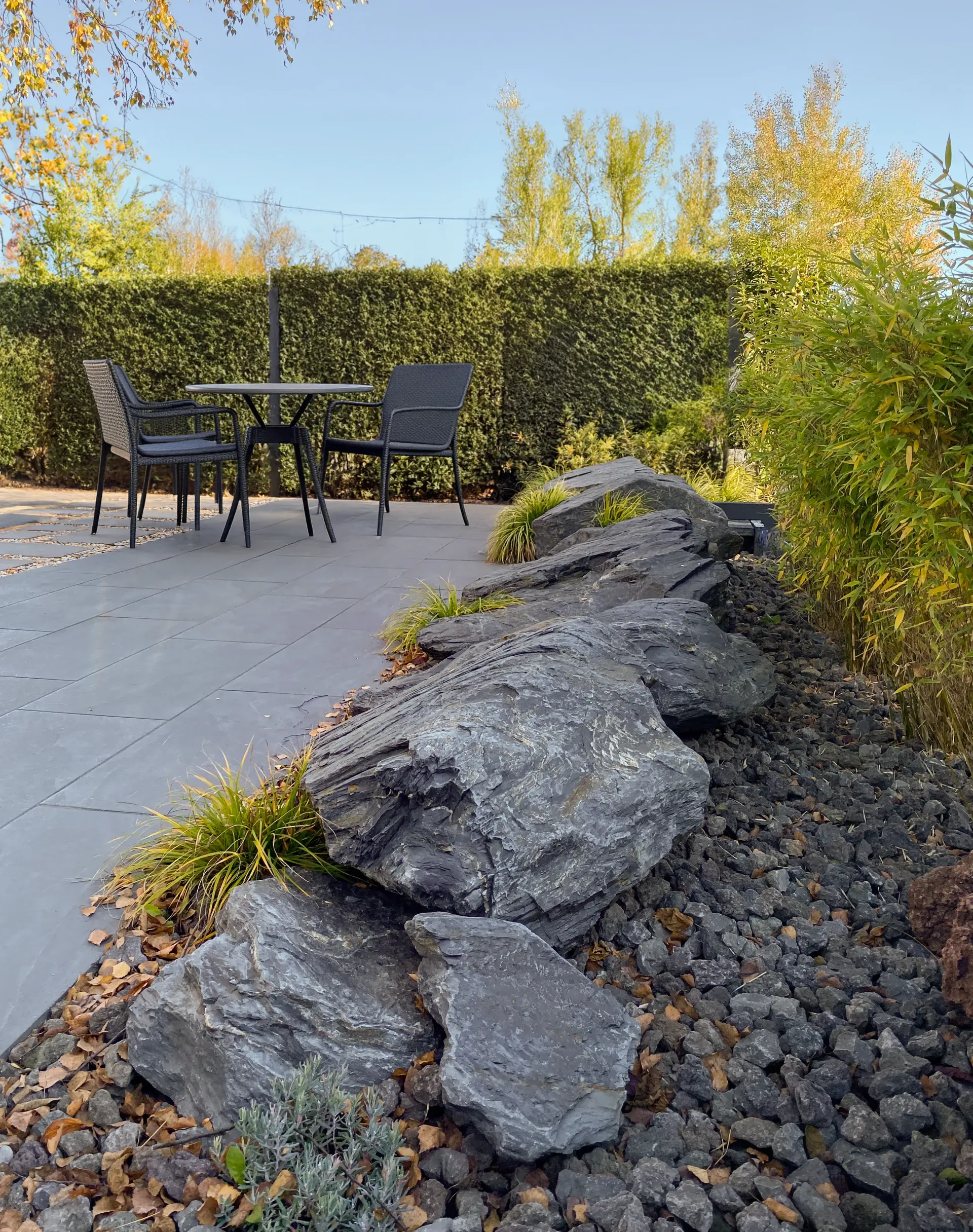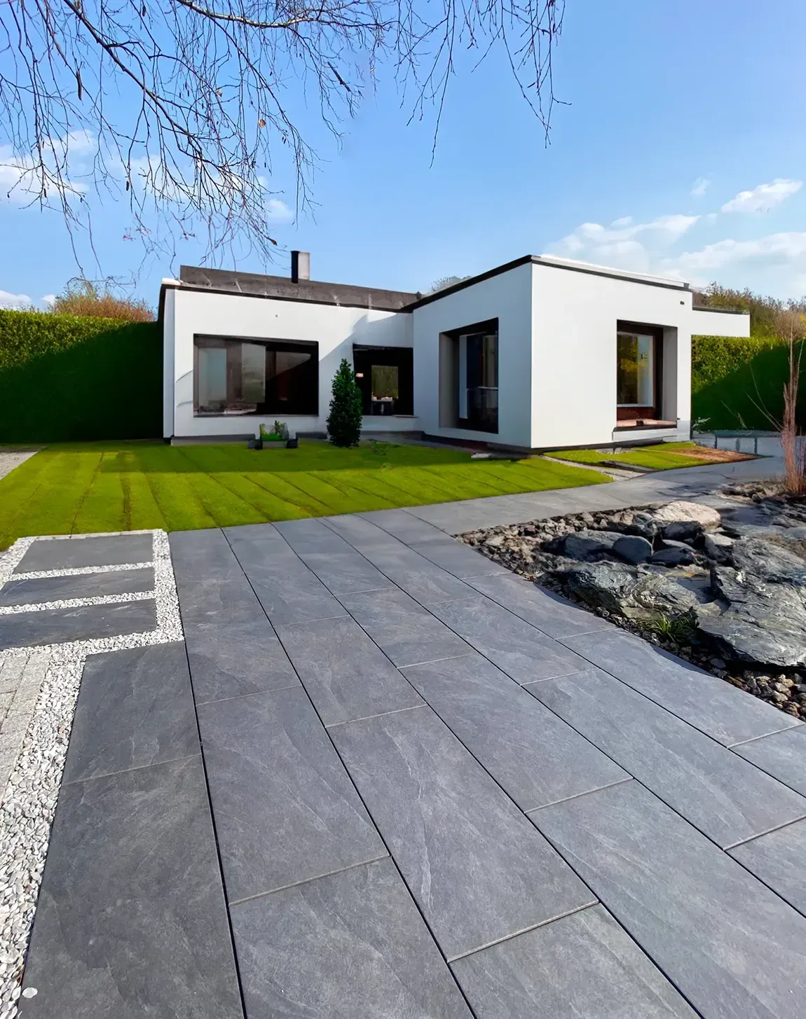 Płyty tarasowe Dark Stone w eleganckich szaro-grafitowych odcieniach charakteryzują się subtelną strukturą inspirowaną naturalną skałą. Ich głęboki, ciemny kolor doskonale kontrastuje z zielenią roślin, podkreślając estetykę przydomowego tarasu.