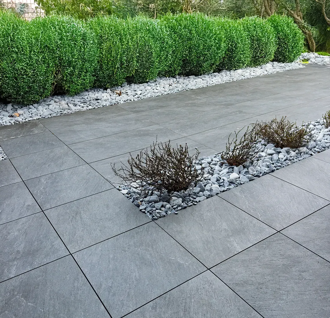Ciemne odcienie szarości, które nadają tarasowi wyrazistości i nowoczesnego charakteru. Dzięki swojej subtelnej fakturze, płytki te doskonale komponują się z elementami industrialnymi, betonowymi i drewnianymi, tworząc elegancką i zarazem surową atmosferę.